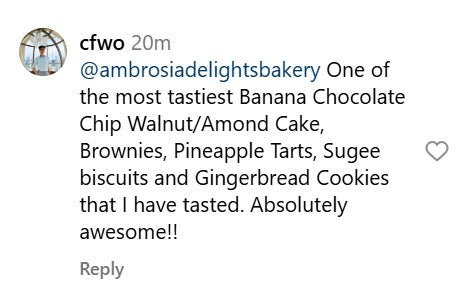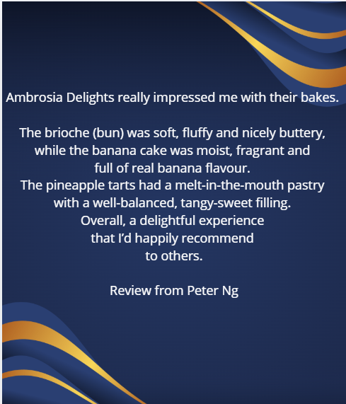 Ambrosia Delights really impressed me with their bakes. The pineapple tarts had a melt‑in‑the‑mouth pastry with a well‑balanced, tangy‑sweet filling. The brioche (bun) was soft, fluffy and nicely buttery, while the banana cake was moist, fragrant and full of real banana flavour. Overall, a delightful experience that I’d happily recommend to others.